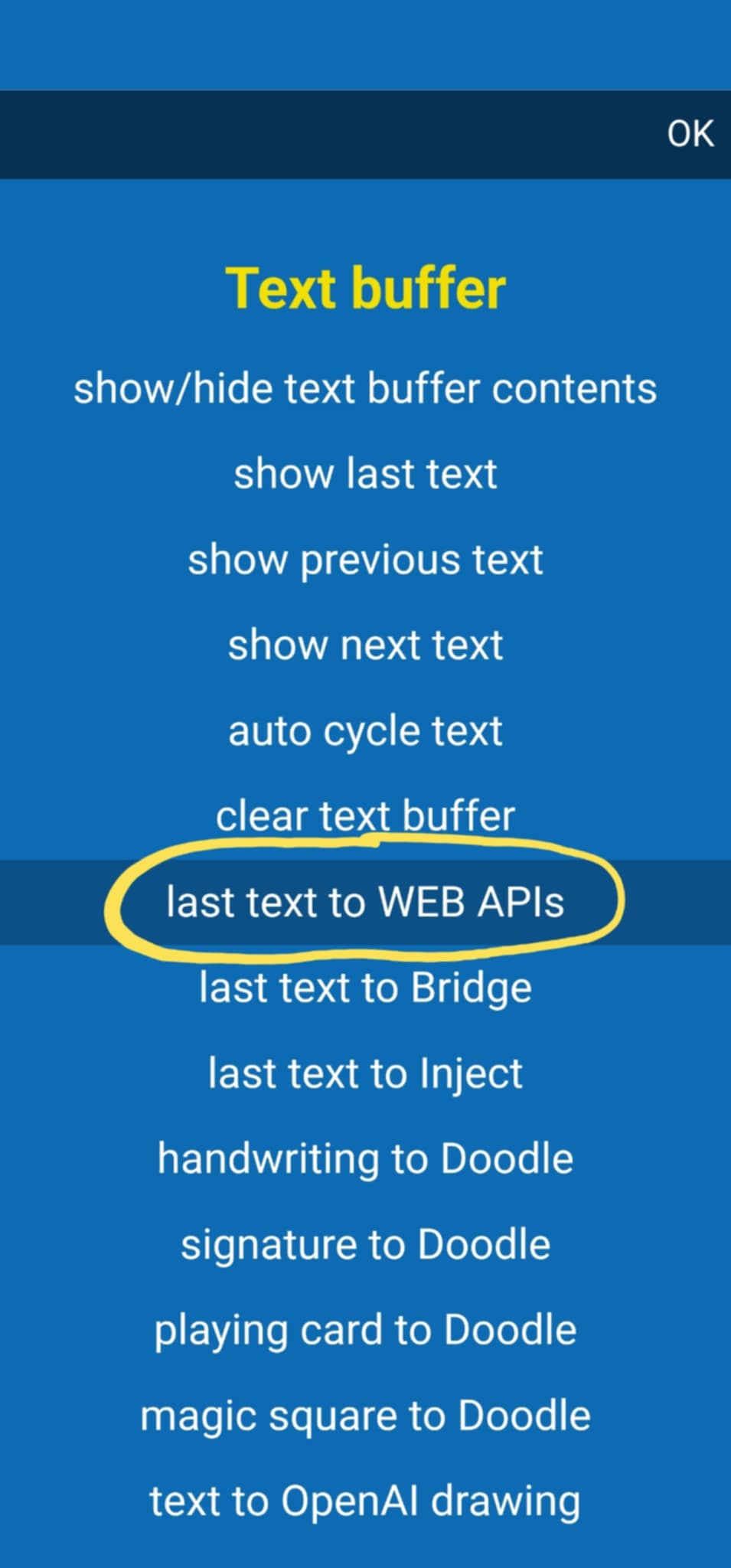 With this method you can send the text not only to Inject, but to any other active WEB API URLs as well. To add Inject as an API URL, you have to go to API + A.I. ACCESS ACCESS and select "Send text to WEB API" - " Manage ". In a new empty field enter " inject " (see the screenshot below), and make sure the toggle is activated. You can add other URLs as well, and activate them with the toggle.