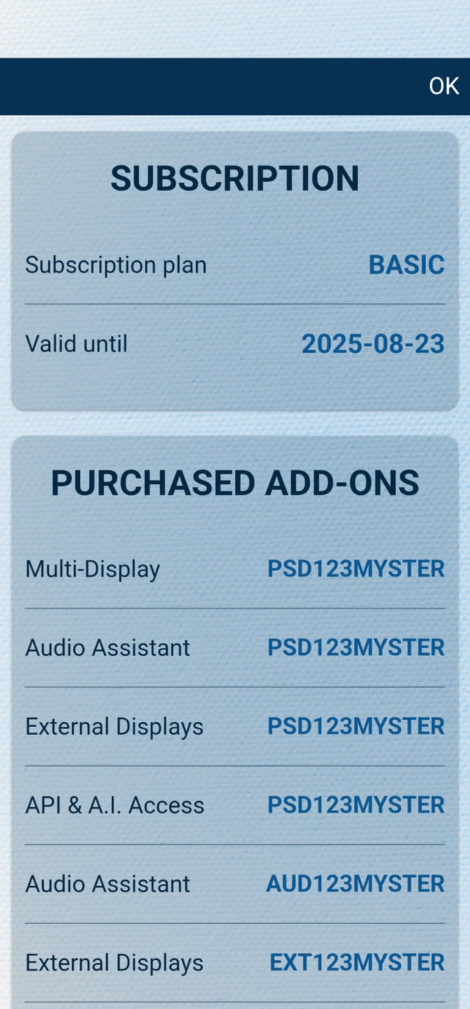 After the code is activated, you can check all your activated add-ons on your account details page. Just tap " Show details " under ACCOUNT SETTINGS, and scroll down to the PURCHASED ADD-ONS section. If you have an active MysterSmith subscription, you will have access to all the available add-ons.