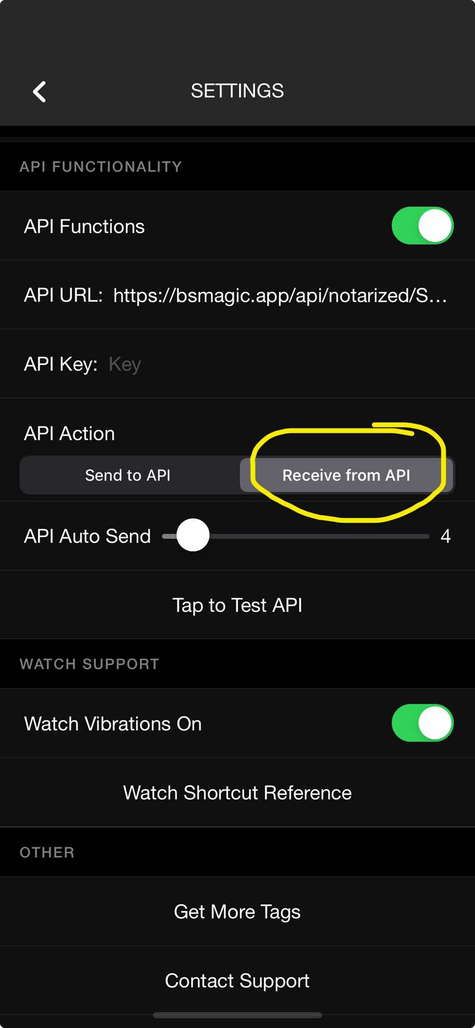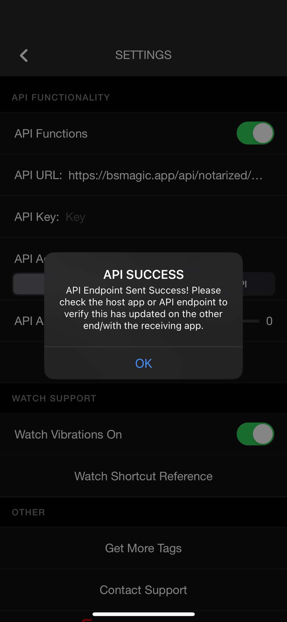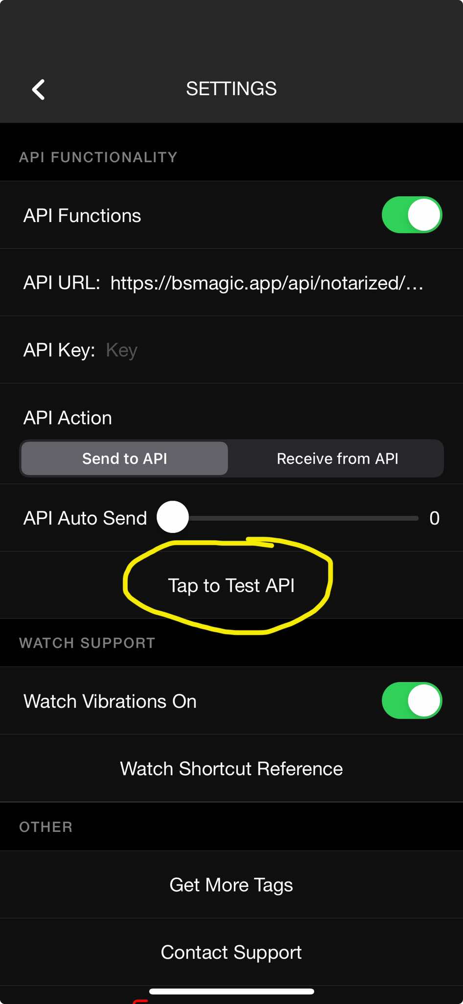 - you can select "Tap to Test API" to test if MysterSmith receives the data correctly