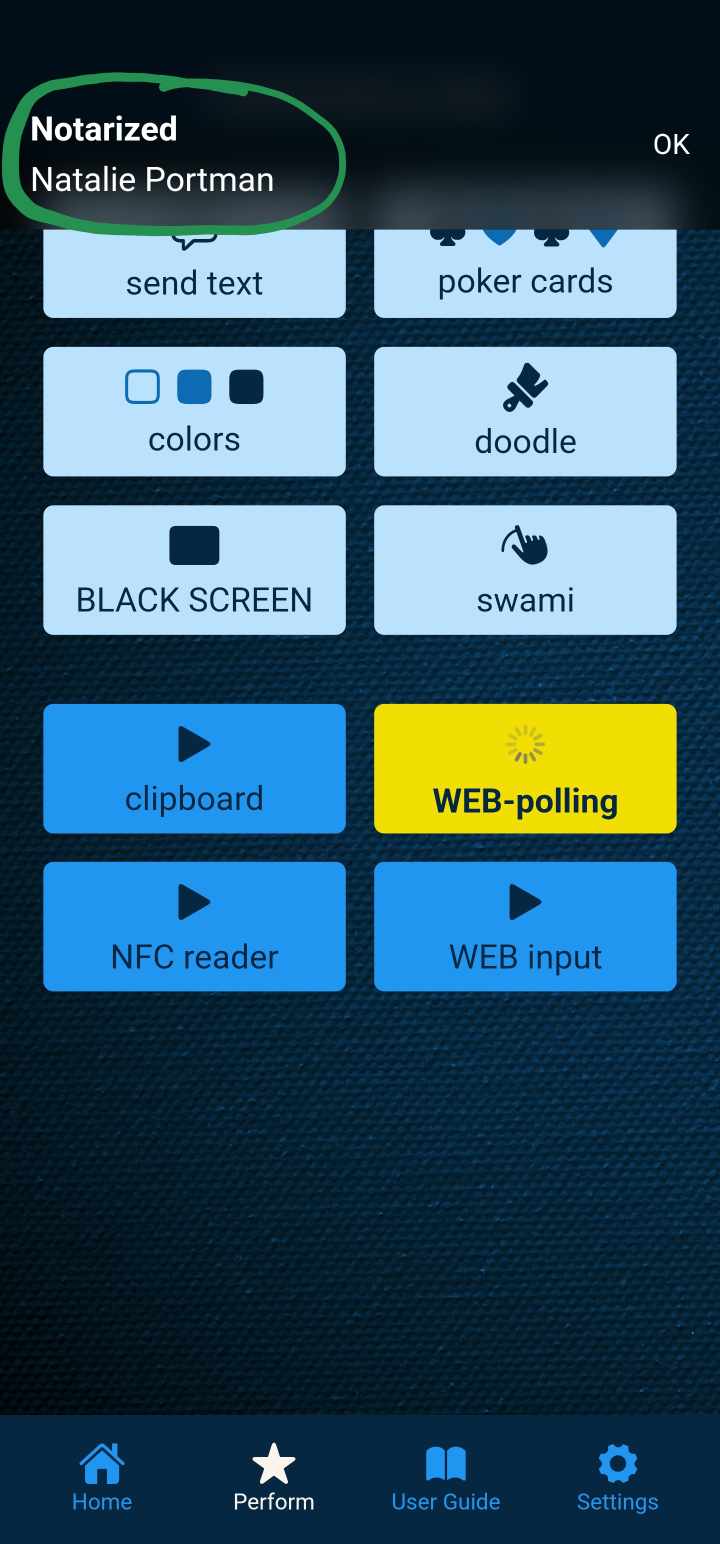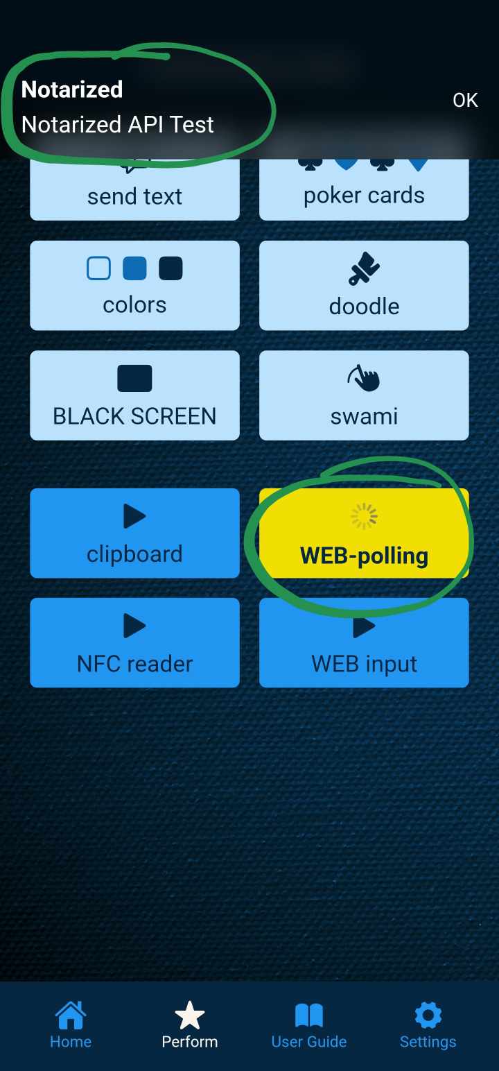 - select "Receive from API" if you want to send text from the MysterSmith app to Notarized (fake Notes app on spectator's phone)