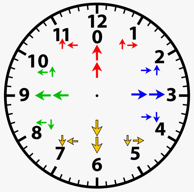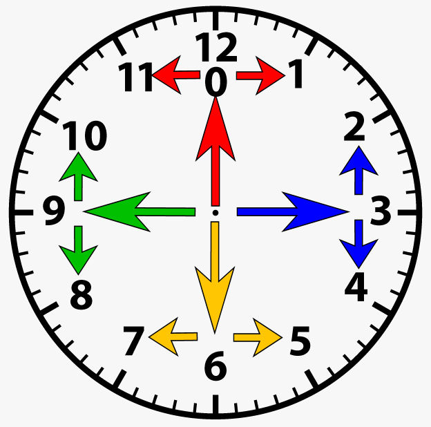 The idea of the clock swipe method is that you can input any number with exactly 2 swipes. For this you'll have to imagine a clock face with numbers 1 to 12 (where number 12 can also represent number 0). You will have to swipe the screen of your phone (or push the buttons of your 4-button BT remote) to any of these 4 directions: UP, DOWN, LEFT or RIGHT.